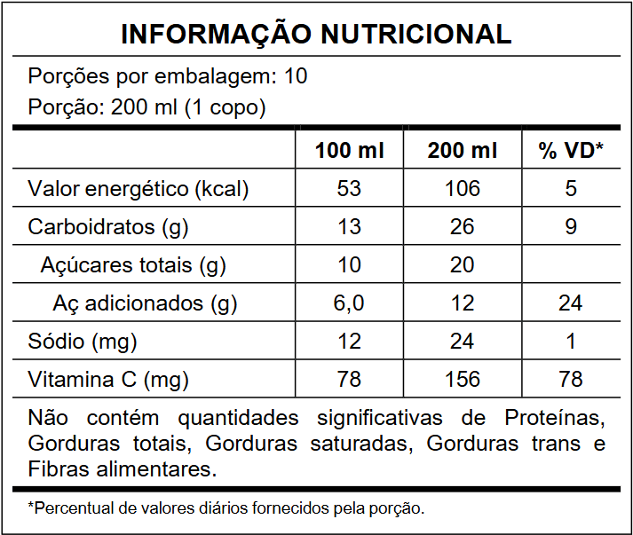 Ingredientes: Água, suco de caju concentrado, açúcar e conservador sorbato de potássio. Pasteurizado. Não fermentado. Não alcoólico. Pode conter castanha de caju. NÃO CONTÉM GLÚTEN.