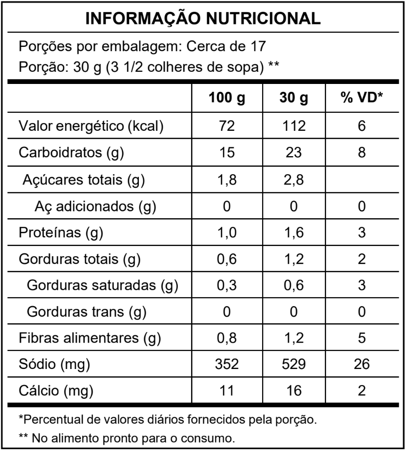 Armazenamento: Temperatura ambiente. Mantenha a embalagem em local seco, fresco e inodoro. Projeja da luz solar e da umidade. Após aberto, manter fechada e consumir no prazo máximo de 30 dias.
