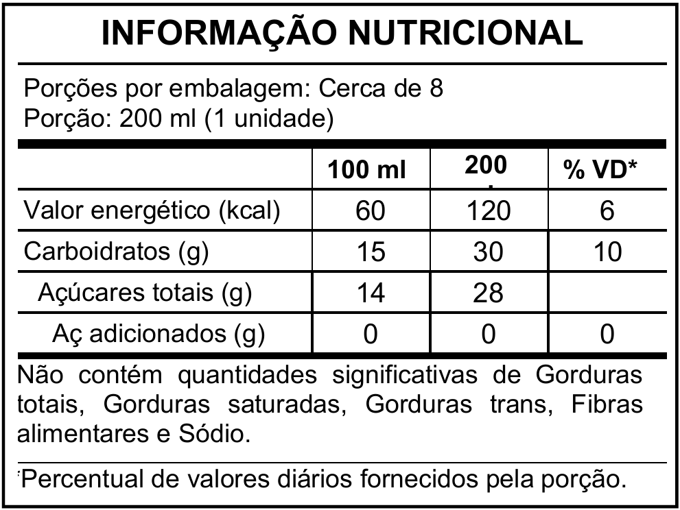 Ingredientes: Suco de uva. Sem adição de água, conservantes, corantes ou açúcares. NÃO CONTÉM GLÚTEN.